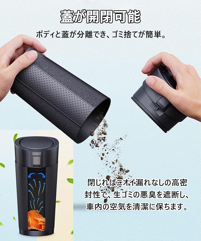 【車載専用設計】漏れ防止密封蓋+転倒防止ベース。急ブレーキや悪路でもごみが散乱せず、車内を清潔に保ちます。