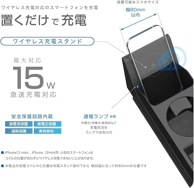 ワイヤレス充電対応のスマートフォンを置くだけで充電できる。最大15W 急速充電対応