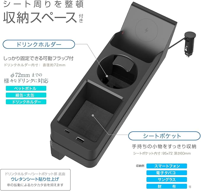 ●シート横に便利な収納ポケット&ドリンクホルダーを追加できる、ワイヤレス充電付 オーガナイザー。