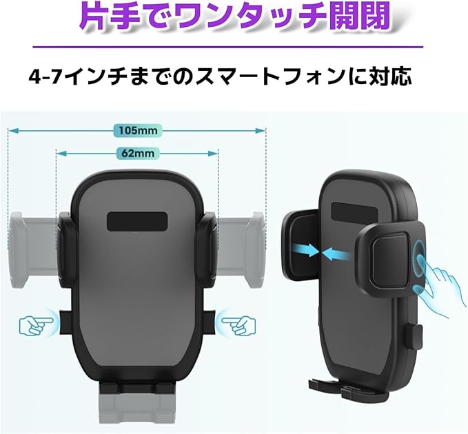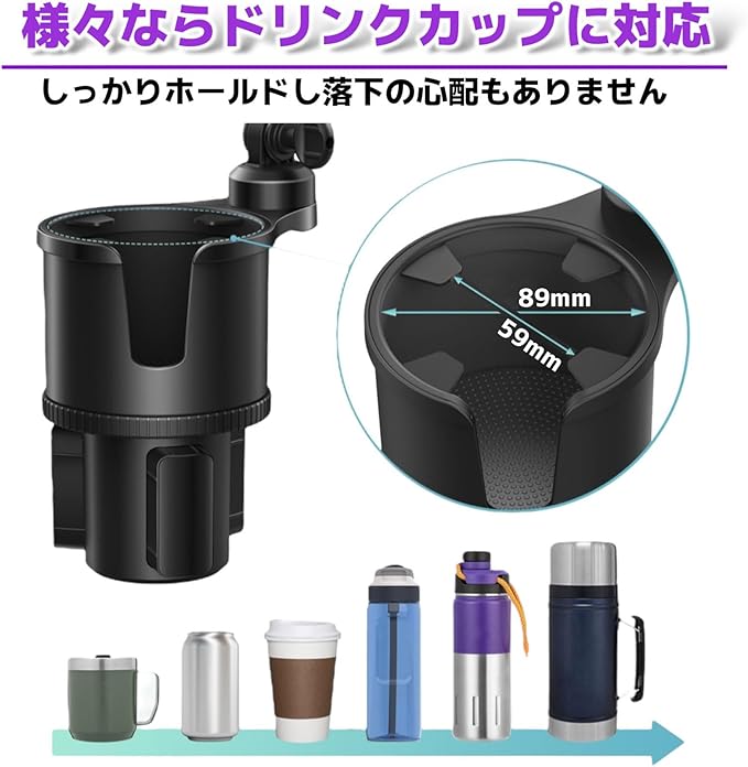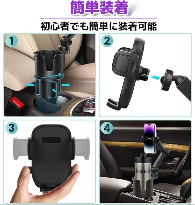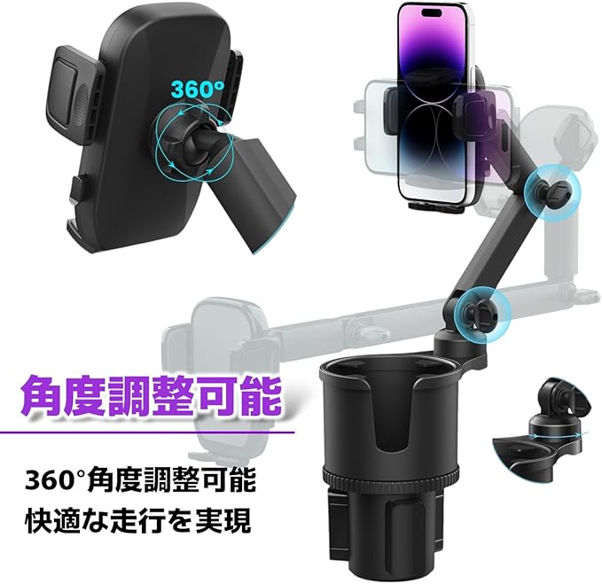 【簡単装着&ラクラク調整】 取り付けは誰でも簡単! 1. カップホルダーのつまみを回して車のカップホルダーにしっかり固定。 2. スマホホルダーはワンタッチで装着&取り外し可能。背面の調整ボタンで幅を自由に変えられます。 360度回転で自由な角度調整もでき、運転中でも視界を遮らず使いやすい設計です。