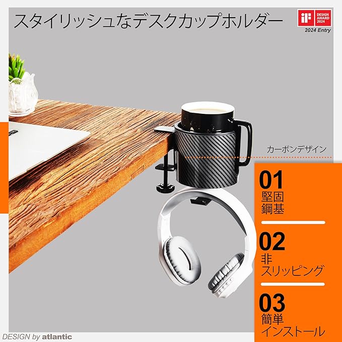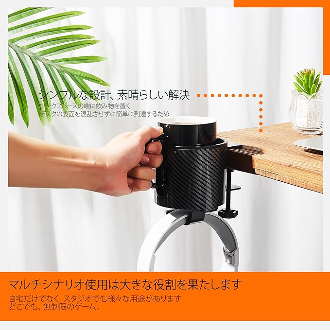 ラグジュアリー2 in 1ドリンクカップホルダー,ドリンクホルダー デスク カップホルダー ドリンクホルダー 多機能収納ラックコンピューターデスク、イヤホンホルダー (carbon design)