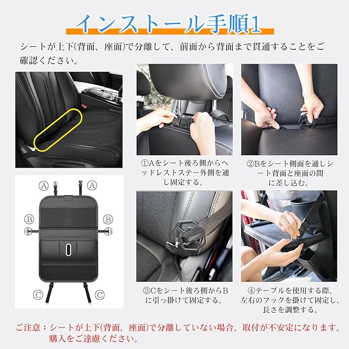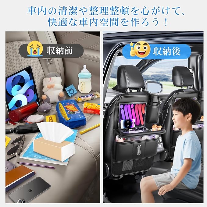 【 1個4役の多機能性・大容量収納で車内を一掃 】 この車用シートバックポケットは、車用収納ポケット、ティッシュケース、シートバックテーブル、キックガードの4役を兼ね備えたカー用品で、車内をすっきり整えます。合計8個の収納ポケット(透明ポケット、レザー製ポケット、耐久性メッシュポケット含む)には、iPad、タブレット、携帯電話、サングラス、傘、書籍、飲み物、子供のおもちゃ、哺乳瓶など多種多様な小物を整理収納可能で、日常のドライブや旅行時に大変便利なグッズです。