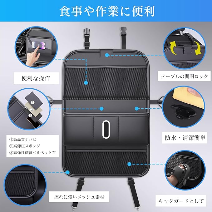 シートバックポケット【1個4役・車用収納ポケット・ティッシュケース・シートバックテーブル・キックガード】後部座席 多機能車内収納 大容量 8つの収納スペース ナパピ 防水防汚 車 シートポケット ドライブポケット ドリンクホルダー 小物入れ カー用品 便利グッズ 車シート収納ポケット 食事 携帯電話収納・タッチスクリーン操作 簡単取付 レザー ブラック
