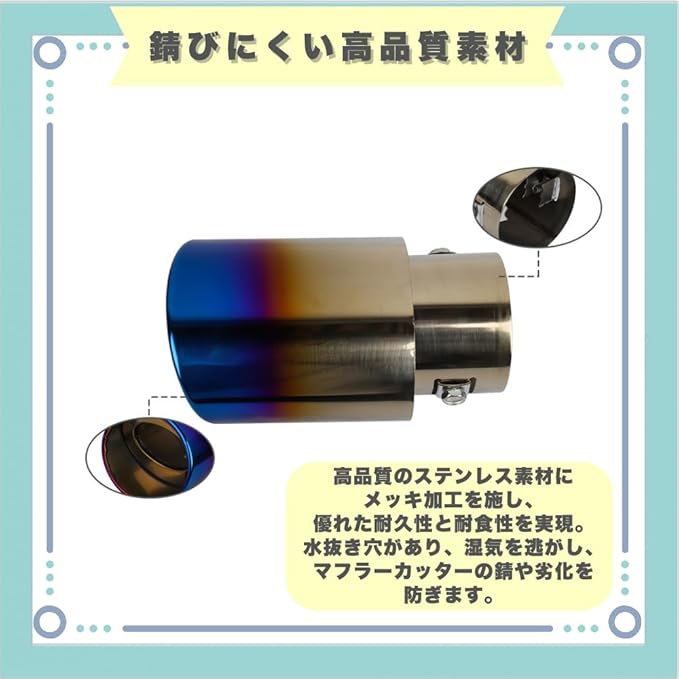 【錆びにくい高品質素材】高品質のステンレス素材にメッキ加工を施し、優れた耐久性と耐食性を実現。水抜き穴があり、湿気を逃がし、マフラーカッターのサビや劣化を防ぎます。