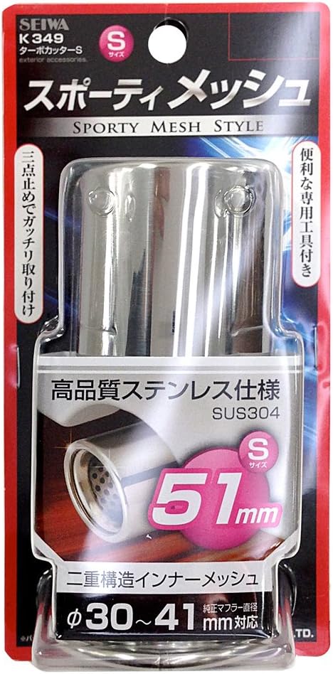 インナーメッシュパイプの後端に絞り加工を入れ、スポーティー感を強調するとともに、より取り付けやすくなりました。高硬度ステンレス(SUS304)使用で軽量で錆びにくいマフラーカッターです。先端のカット&ロール加工により高級感を演出します。特殊ネジ(イモネジ)2本とコの字金具で取り付けるので確実な取り付けが可能です。純正マフラーの外径30~41mmφの車種に取り付けできます。