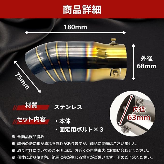 【愛車の印象を一瞬で格上げ!下向きマフラーカッター】あなたの愛車にさりげない個性と高級感をプラスしませんか?この車用マフラーカッターは、63mmサイズと汎用で幅広い車種に対応し、トラックから軽自動車までドレスアップが可能です。耐久性に優れたステンレス製で、チタン風の美しい仕上がりが特徴。時間が経っても錆びにくく、愛車の足元をずっと美しく保ちます。 【高級チタン風デザイン】シンプルながらスポーティな雰囲気を演出し、他の車と差をつけます。手軽に愛車をドレスアップできる最強アイテム。 【簡単取付】工具が少なくてもOK!初心者でも手軽に装着可能。汎用性抜群:63mm径でさまざまな車種に対応。軽自動車からトラックまで幅広くフィット。 【手軽にドレスアップ!】手軽に愛車をドレスアップできる最強アクセサリーです。【こんな方におすすめ】愛車の印象を手軽に変えたい方。排気音を変化させたい方。シンプルなドレスアップを探している方。 【注意事項】取り扱い説明書はありません。取付、適合確認のサポートは行っておりません。画像及び寸法をご参考にご判断ください。※海外生産品の為、製造上のバリ、若干の色ムラ、輸送時の小傷等が発生する場合がございます。またモニター環境により実際の色と違って見える場合がございます事、予めご了承の上ご購入下さいませ。