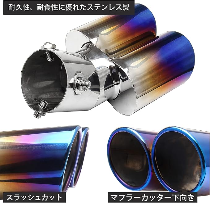 マフラーカッター 2本出し 下向き ステンレス製 取り付け直径 30mm~60mm デュアル 軽自動車 汎用 跳ね上げ 大口径 エアロパーツ ドレスアップ チタン カラー