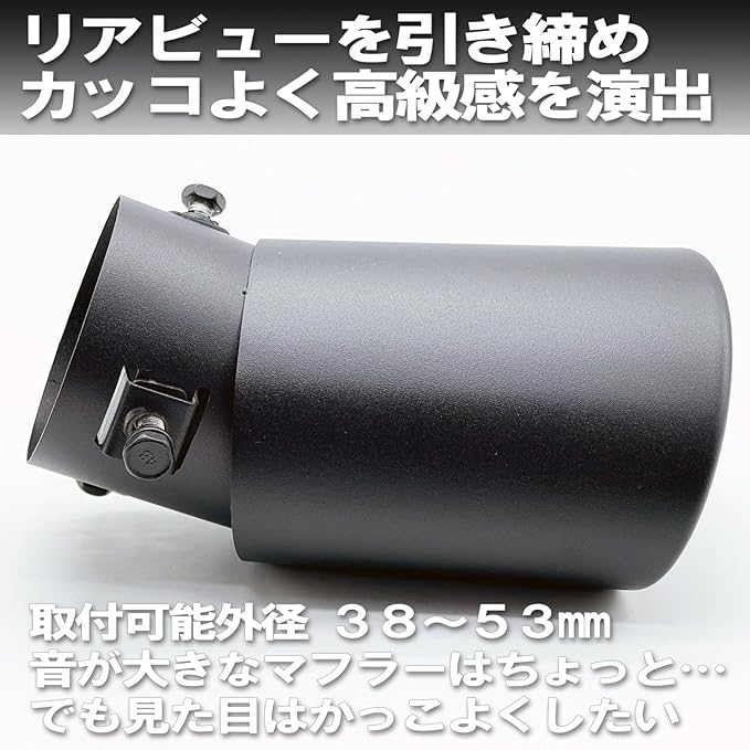 ボルト締め付けタイプで取り付けも簡単。取り付け可能な管外径は38mmから53mmです。必ずお車のマフラー形状をご確認ください。