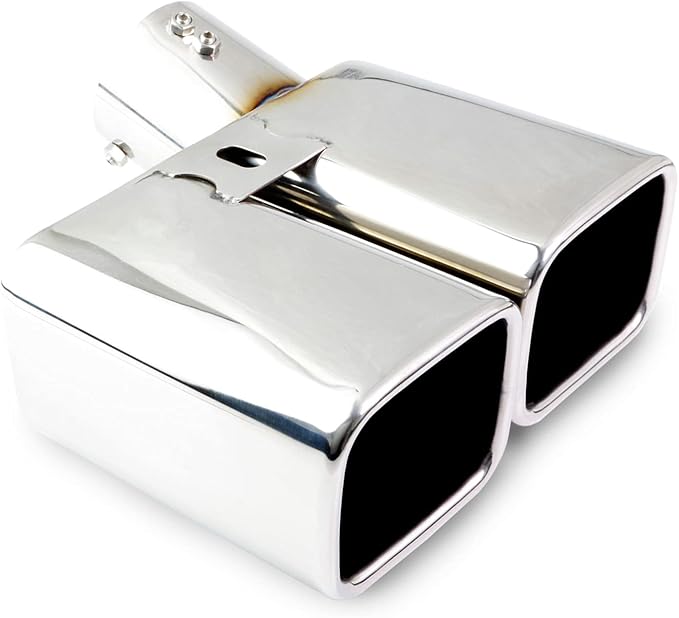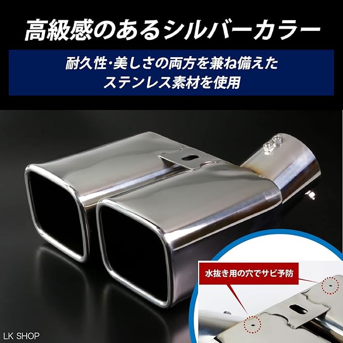 肉厚で重厚感のあるステンレス製マフラーカッターです。スクエア2本出し形状で、やんちゃ過ぎず大人しくスタイリッシュな雰囲気が魅力。