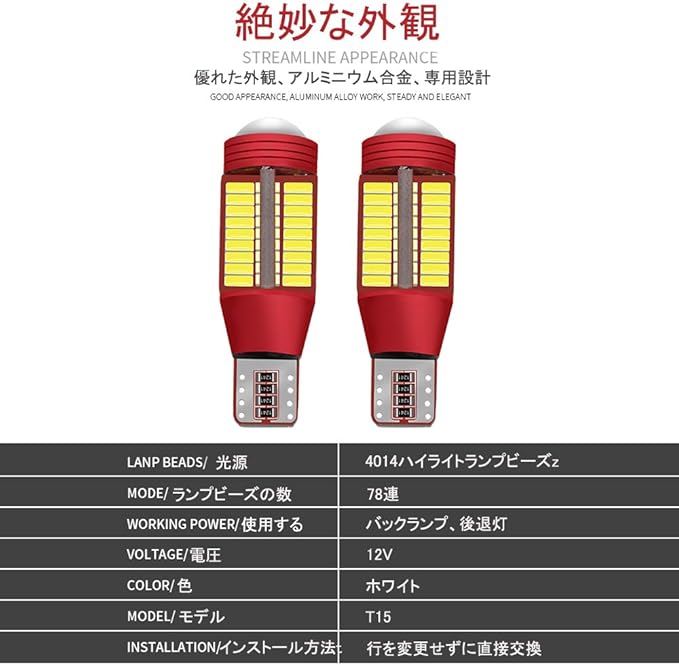 このバックランプは、T16/T15 W16W ソケットに対応し、最新の4014LED素子78個を搭載しています。360 全方位照射で、大部分の車種でエラーフリーのCANBUSキャンセラーを内蔵しています。超高輝度2500LMの明るさで、原装ランプより3倍明るく、省エネで長持ちします。6000K純白の光で、環境保護、汚染なしで、優れた放熱性と耐久性を持つアルミヒートシンクを採用しています。12V-24V車用で、消費電力は8W(原装ランプは18W)で、純正球(T16)とほぼ同じサイズなので、極性フリーで取付が簡単です。24Vの自動車では使用できないため、トラック、トラック、ワゴン車、バスでの使用は禁止されています。