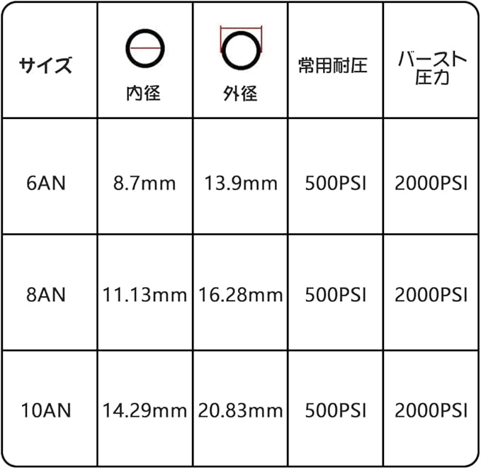 【商品仕様】:サイズ:AN6 長さ:1M 内径:8.7MM 外径:13.9MM 使用温度範囲:-40-148.9℃