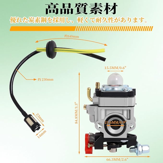 このキャブレターは、ワルボロ社WYJタイプのキャブレターを交換するための互換品で、26ccから33ccの刈払機に対応しています。対応する草刈り機の排気量は26ccから33ccで、取付穴の距離は31mm、ベンチュリー径は10mmです。軽くて耐久性のある優れた炭素鋼を採用し、パッケージにはプライマリーポンプ、スペーサー、燃料ホースセットが同梱されています。この商品は互換品であり、ワルボロ社の純正品や正規品ではありませんのでご注意ください。