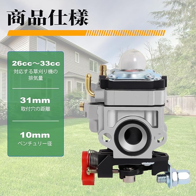 【商品仕樣】対応する草刈り機の排気量:26cc~33cc、取付穴の距離:31mm、ベンチュリー径:10mm。