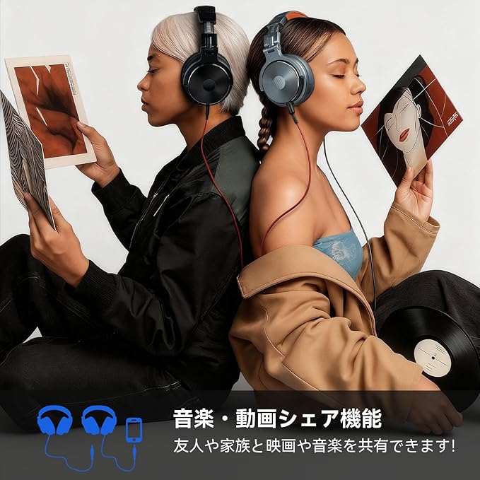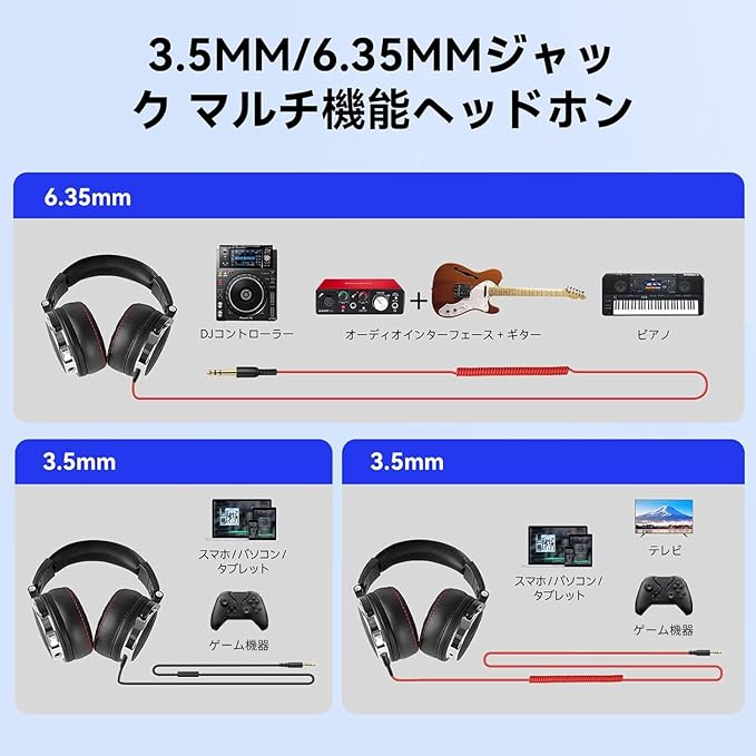 【楽器練習・音楽シェア】ヘッドホンの両側に6.35mmと3.5mmジャック付き、様々なオーディオ設備と接続可能。楽器と接続した場合、パワーアンプによってヘッドホンの機能を最大限に活用できる