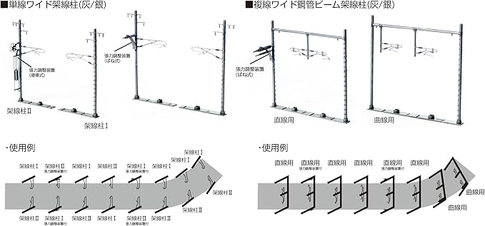 架線柱 (直線用・曲線用)各6本と、地上用架線柱台12個、張力調整装置 (ばね式)は予備を含む6個入 (4ヶ所へ取付可能)。