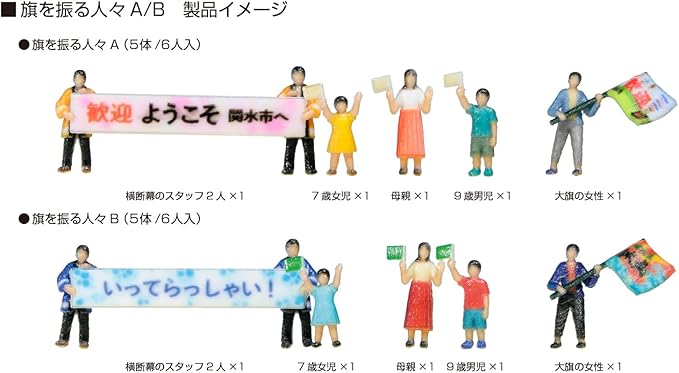 横断幕を持つスタッフ2人 1、小旗の児童 2 (7歳女児、9歳男児)、小旗の母親 1、大旗の成人女性 1の5体/6人入。