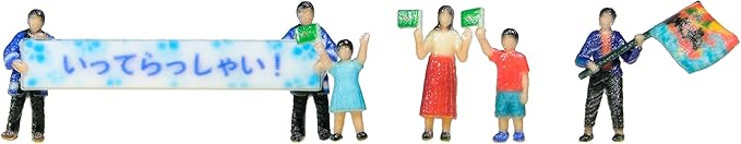 観光列車や記念列車に向かって旗を振り、横断幕を掲げてお出迎え・お見送りする姿を再現した1/150スケールの人形が登場。観光列車のお出迎えやお見送りのワンシーンで見られる、旗や横断幕を掲げて歓迎する様子を演出し、ジオラマにストーリーをプラスするアイテムです。