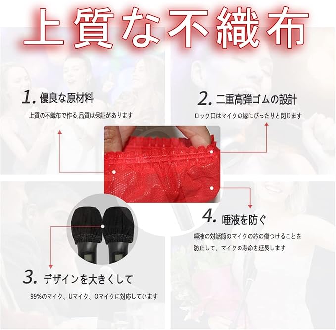 【素材】やわらかい不織布で作られており、無毒、無臭、衛生的で環境にやさしい。高品質で、伸縮性があるので、U型マイクでもO型マイクでも装着できます。