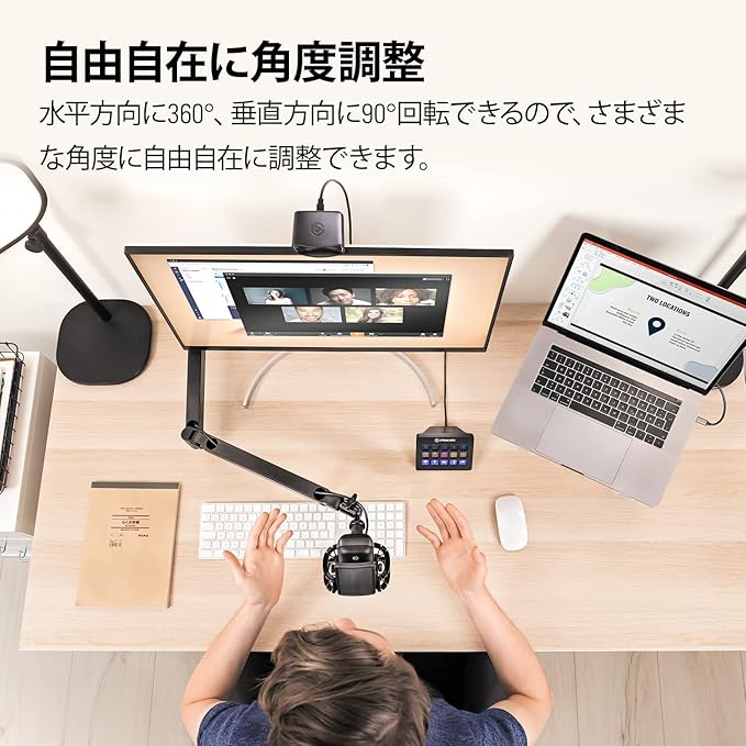 自由自在に角度調整:水平に360 、垂直に90 回転 (上向き)。