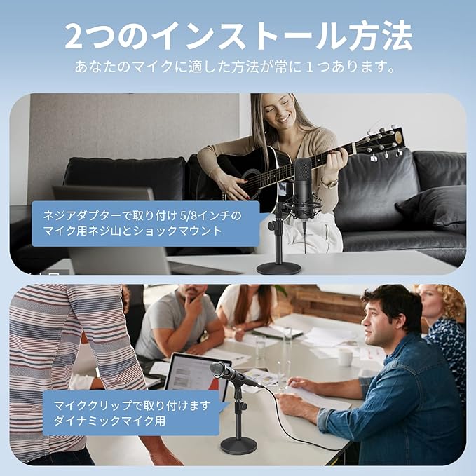 高さ調節が可能です: デスクトップマイクのスタンドの高さは、26cmから36cmまで調整可能です。他のスナップイン式スタンドは長時間使用すると緩むことがありますが、当社のねじ込み式スタンドはより安全でタイトなので、高さが滑り落ちることなく確実に固定されます