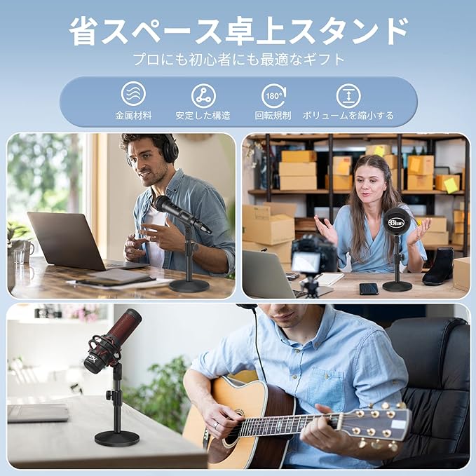 アップグレードされた安定したベース: 頑丈な金属素材を使用し、ベースの直径を大きくすることでマイクスタンドの重量は約600gに増加し、簡単に倒れることはありません。3つの滑り止めパッドが丸いベースの底に追加され、傷からあなたのテーブルを保護し、卓上マイクスタンドを移動するときにノイズを引き起こすことはありません