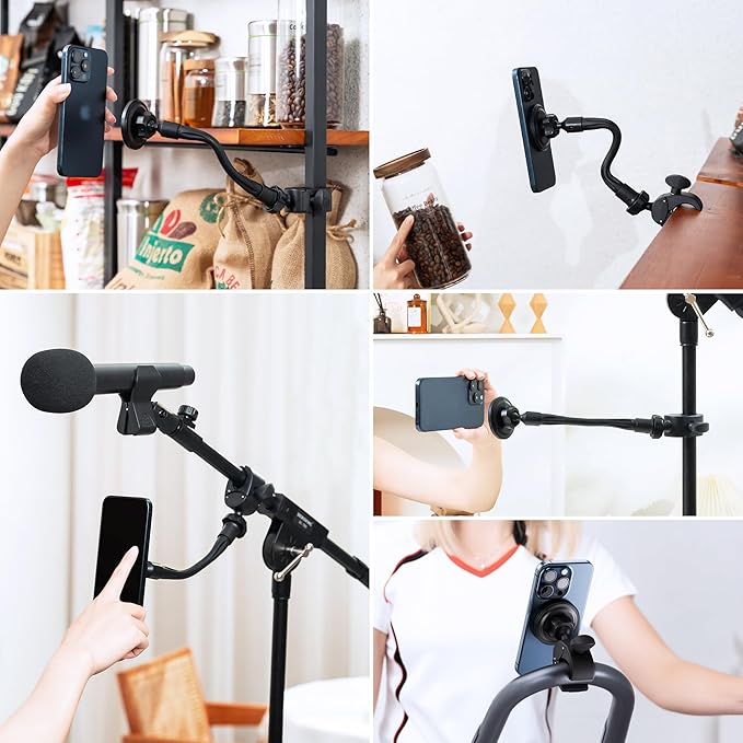 【互換性]】このマイクスタンド用電話ホルダーの一端は、iPhone 17/16/15/14/13/12 シリーズ iPhone Air の携帯電話または磁気機能付き電話ケースに直接磁気的に取り付けることができます。もう一方の端は、譜面台、ドラムスタンド、三脚、ルームランナーなど、直径15-45mmのハンドルバーに取り付けることができます。