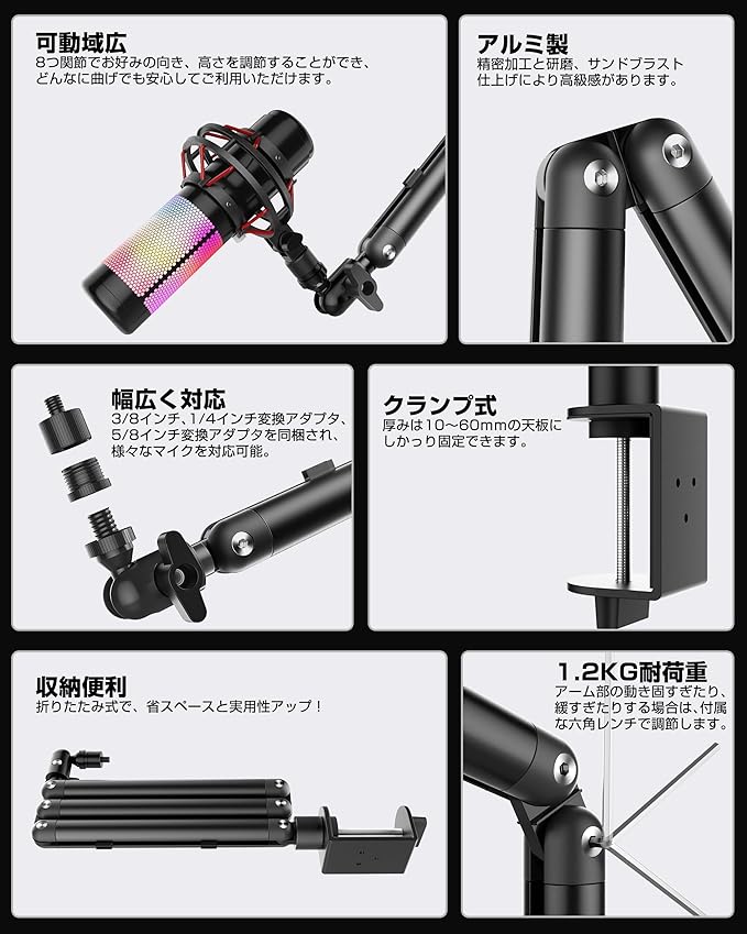 【可動域が広く、角度自由調整】本製品は8つ関節があり、可動領域が広いのスタンドとして、お好みの向き、高さを調節することができます。どんなに曲げでも安心してご利用いただけます。デスクを広く使ったり、マイクを見やすい位置に移動できたり、作業効率が上がります。折りたたみ式で、省スペースと実用性アップ! 収録、動画配信、生配信、オンライン授業、カラオケ、ギター、ドラム、ピアノ、宅録などに大活躍です。
