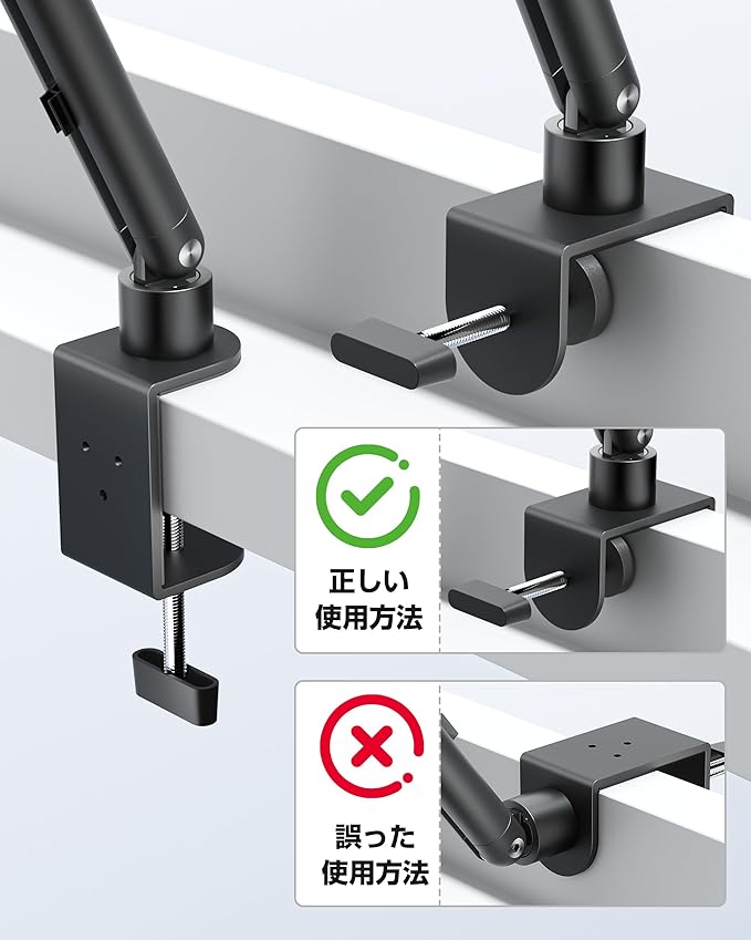 【アルミ製・ケーブルガイド】アーム全体は頑丈なアルミニウム合金で作られ、精密加工および研磨され、表面はサンドブラスト加工が施され、見た目にも高級感があふれています。クランプできる面の厚みは10-60mmです。クランプにはシリコンパッドが付き、テスクを傷つける心配ではありません。アームにケーブルガイドがあり、常時給電用のケーブルの配線がきれいになります。