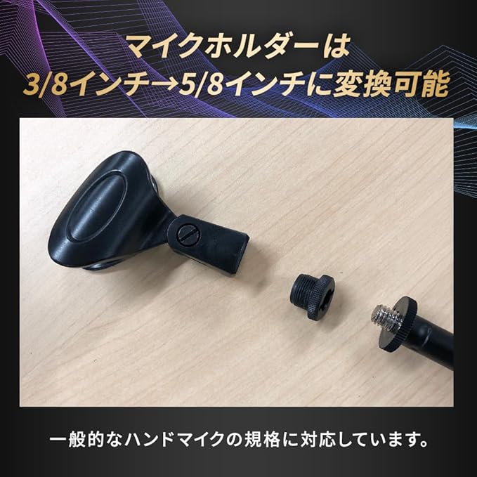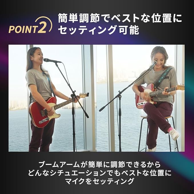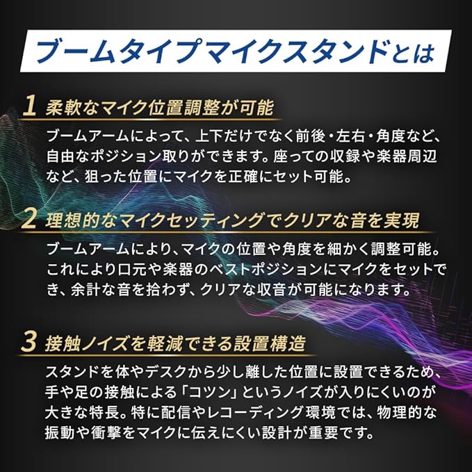 ■ブームアーム付マイクスタンド ■カラー:ブラック ■先端ネジ径:3/8インチ ■付属品:マイクホルダー(3/8インチ→5/8インチ変換ネジ取付済) ■高さ調整範囲:約96cm~約155cm ■ブームアーム長さ:約76cm ■折り畳み時全長:約95cm ■重量:約1.5kg