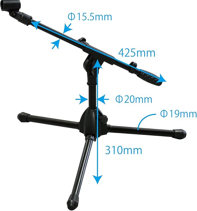 高さ310mm、ブーム部長さ425mm と低い位置からのマイキング、宅録で活躍するサイズです。また、ブーム部の取り外しが可能で、高さ205mm のショートスタンドとしても使用可能。マイクホルダー、ケーブルタイ、キャリングバッグ付