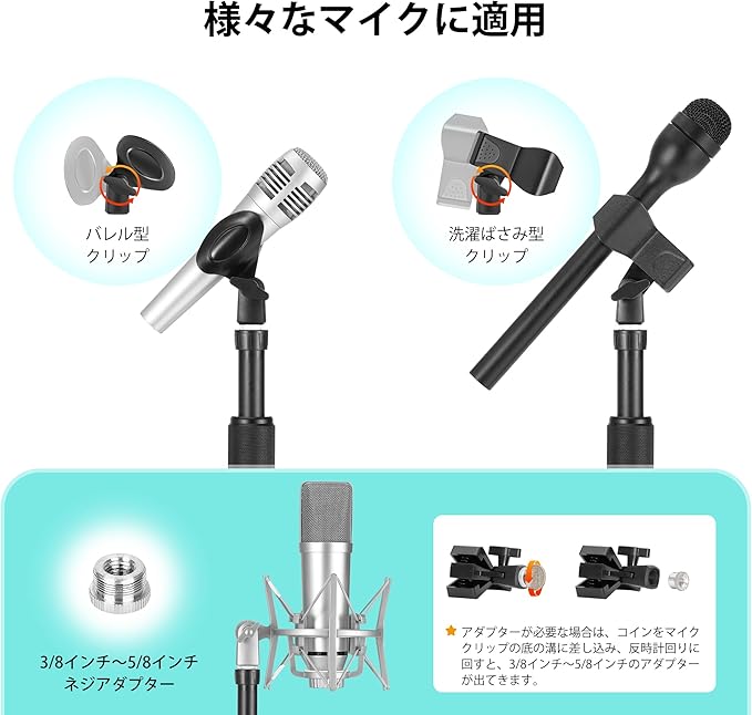 【様々なマイクに適用】本マイクスタンドは様々なマイクに対応し、バレル型クリップと洗濯ばさみ型クリップの2種類が付属しています。アダプターが必要な場合は、コインをクリップ底面の溝に差し込み、反時計回りに回すと、内蔵された3/8インチから5/8インチへのネジアダプターを取り出すことができます。