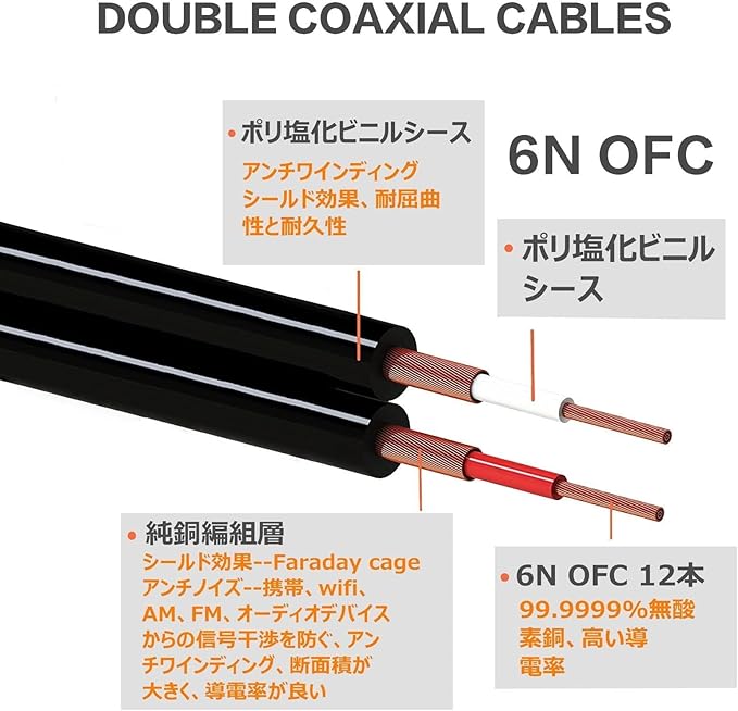 導体は高純度的な6N無酸素銅(Oxygen Free Copper)の線材を採用し、不純物を除去した99.99995%以上の高純度無酸素銅を使用するから、信号の伝送ロスや歪みを抑えることができます。外観も美しく、柔らかでよくしなり使用中でよりよく高音質を確保可能。