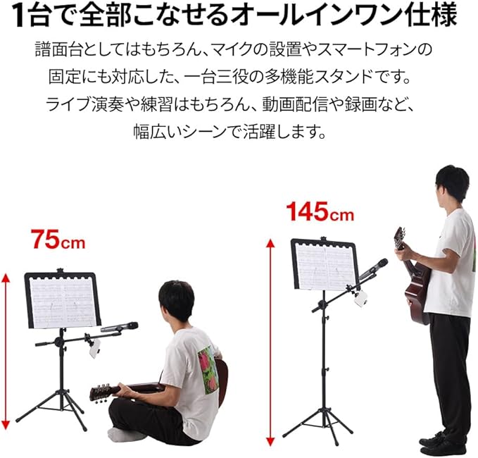 譜面台としてはもちろん、マイクの設置やスマートフォンの固定にも対応した、一台三役の多機能スタンドです。