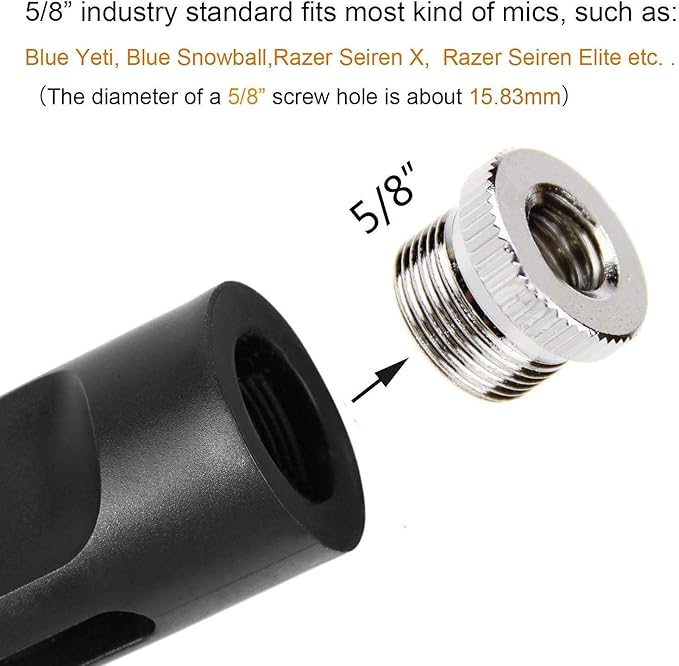 マイクボルト、マイクスタンド、3/8"ネジ穴と5/8"ネジあるマイク製品などに対応します。例えば、Blue Yeti、 Blue Snowball、 Razer Seiren X、Razer Seiren Eliteなど。