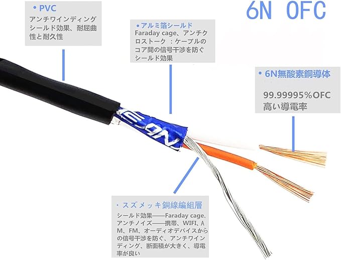導体は高純度的な6N無酸素銅(Oxygen Free Copper)の線材を採用し、不純物を除去した99.99995%以上の高純度無酸素銅を使用するから、信号の伝送ロスや歪みを抑えることができます。外観も美しく、柔らかでよくしなり使用中でよりよく高音質を確保可能。