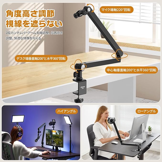 【高さと角度を自由に変更】高さや角度は、ノブで簡単に調整できます。マイク端軸は220 回転、中心軸は垂直軸200 と水平360 回転に対応し、下部のデスク端垂直軸200 と水平360 回転に対応しています。360 ボールヘッドがあり、用途に合わせて位置を簡単に設定することができます。アームの関節可動域はもっと幅広いです。フルレンジのモーションで快適なライブ配信ができます。