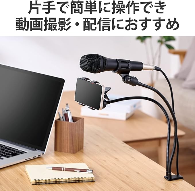 フレキシブルに動くアームによってスマホとマイクの位置を片手で簡単に調節し、スマホを使った動画撮影や動画配信を快適に行えます。