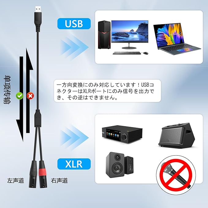 【単方向伝送】一方向変換にのみ対応しています!USBコネクターはXLRポートにのみ信号を出力でき、その逆はできません。XLRポートにはマイクを接続できません。