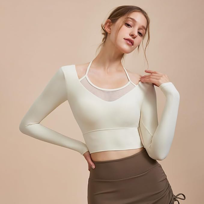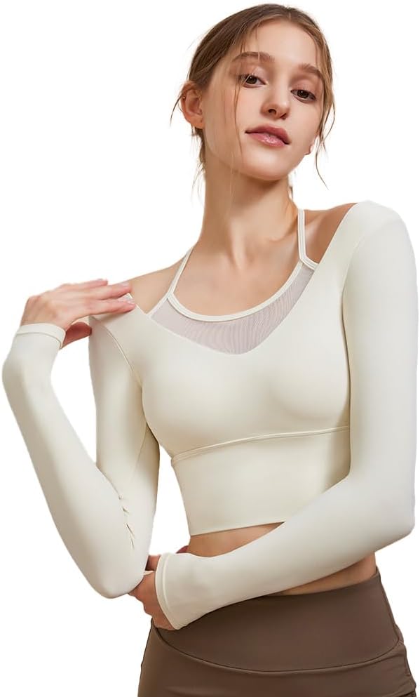 [Yomoment] メッシュ切り替え フェイクレイヤード ブラトップ カップ 付き 長袖 ヨガウエア シャツ トップス