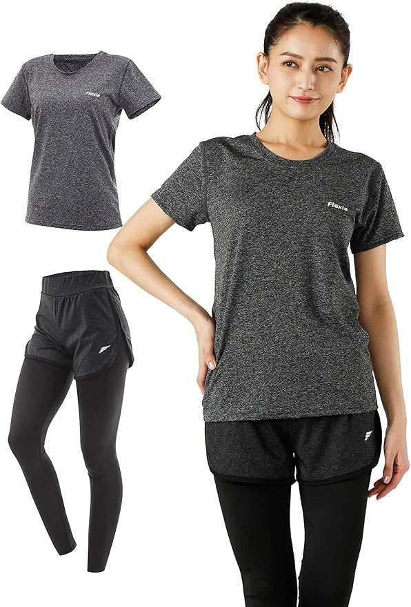 [Flexia フレキシア] ヨガウェア レディース スポーツウェア ピラティス トレーニング 上下セット セットアップ 体型カバーできる 半袖 Tシャツ パンツ レギンス 一体型 ジム 速乾