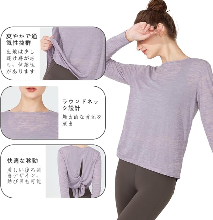 [Siomlana] 背中おしゃれ ヨガウェア 長袖 涼しい スポーツ シャツ レディース トップス ングtシャツ ピラティス 長袖ウェア おしゃれ 美背 ゆったり ストレッチ 吸汗速乾 通気性 やや透け感 シンプルデザイン ジム ランニング フィットネス