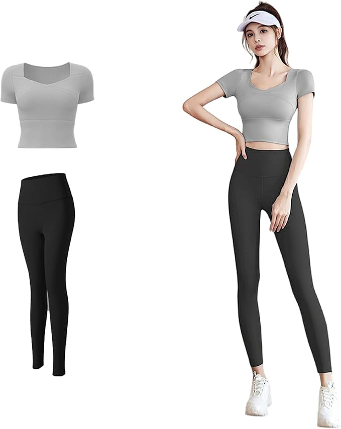 [Karsaer] ヨガウェア 上下セット レディース ピラティスウェア 半袖 スリムフィット ハイウエストヨガパンツ タイツ お腹引き締め ヨガウェア おしゃれ 通気・伸縮性 吸汗速乾 トレーニングウェア カップ付き レディース ジムウェア A0013 | A GEN STORE