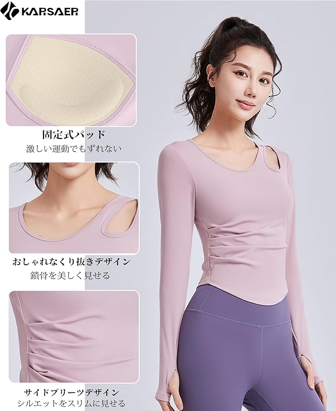 [Karsaer] ヨガウェア レディース 長袖 トップス カップ付き 指穴付き Tシャツ ストレッチ スポーツウェア 体形カバー 吸汗 速乾 通気 揺れない フィットネス トレーニング ヨガ プルオーバーA0067