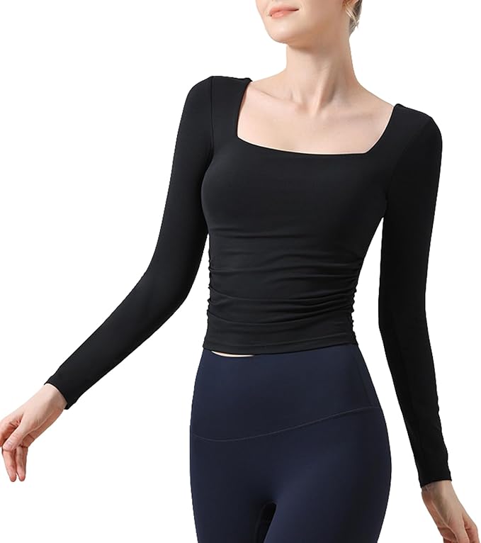 [Karsaer] ヨガウェア トップス 長袖 レディース カップ付き Uネック 吸汗速乾 通気性 体型カバー フィットネス ジム ホットヨガ ピラティス おしゃれ スリムフィットA0037