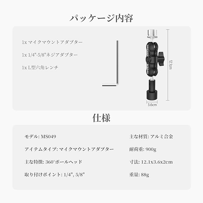 NEEWER マイクマウントアダプター ブームアームマイクスタンドクランプホルダー用 マイクアームアダプター 360 デュアルミニボールヘッドマジックアーム アルミ合金製 マイクスタンドアダプター 1/4"-5/8"ネジアダプター付き マイクアクセサリー 最大荷重900g MS049