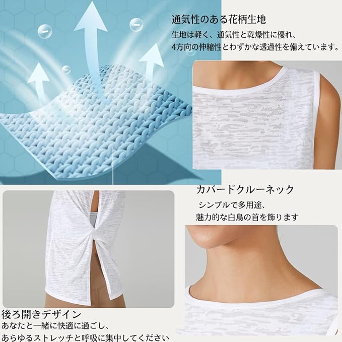 [Yodilala] ヨガウェア レディースノースリーブタンクトップ 美背中デザイン 体型カバー 冷感Tシャツ クルーネック 無地 ロングゆったりシルエット スポーツ ルームウェア フィットネス トレーニング 吸汗速乾 UVカット