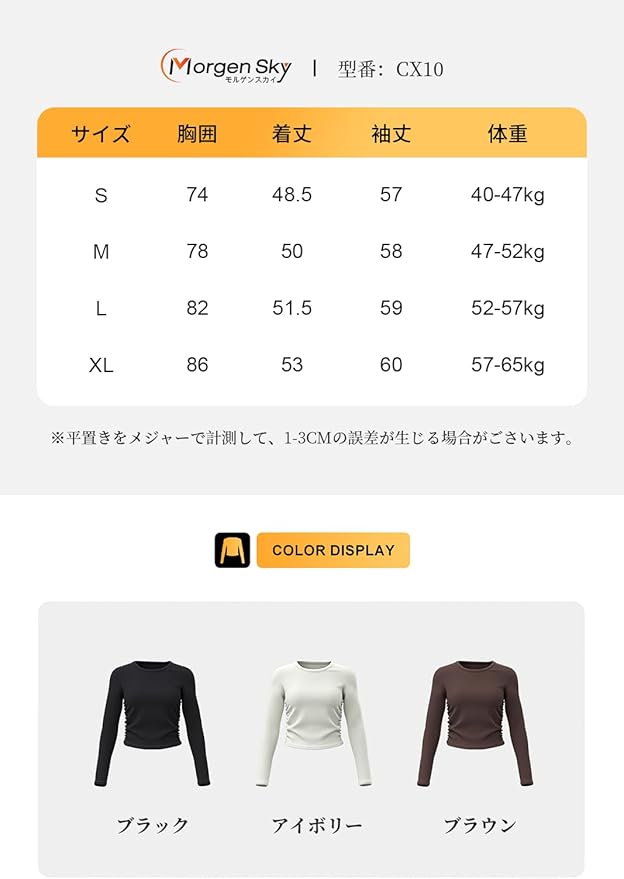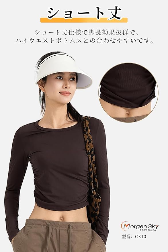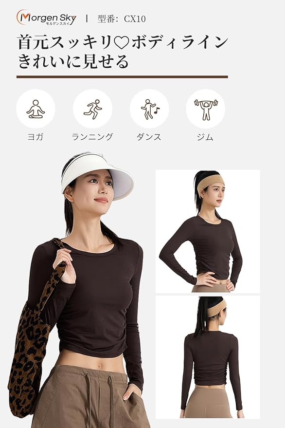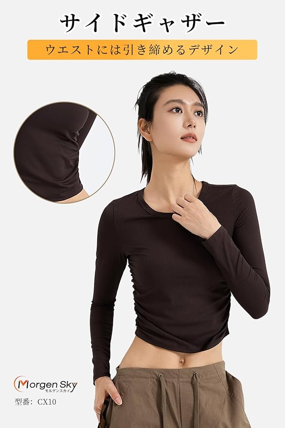 [MORGEN SKY] ヨガウェア レディース 長袖 Tシャツ トップス Uネック ショート丈 サイドギャザー インナー スポーツウェア フィットネス トレーニング 吸汗 速乾 通気 おしゃれ ロングスリーブ プルオーバー CX10