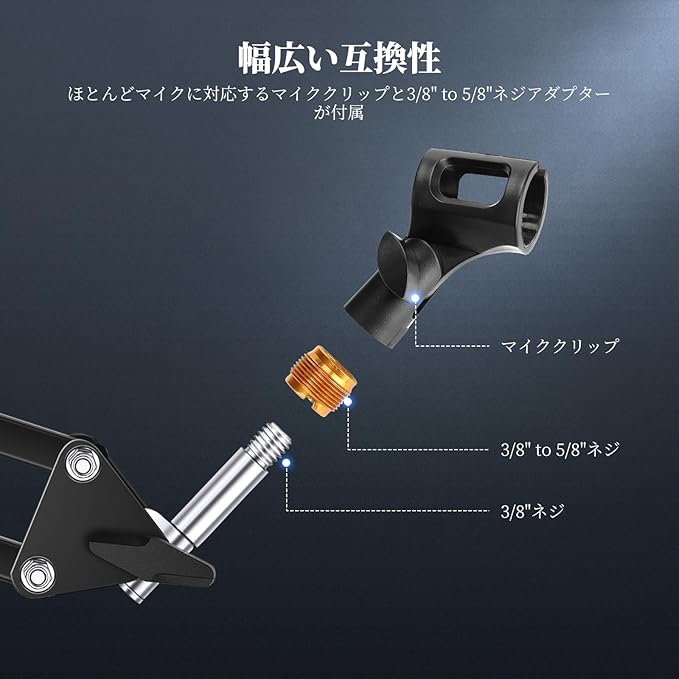 【幅広い互換性】マイククランプには、3/8" to 5/8"までネジアダプターが2つ付属しており、28mm-35mmまでユニバーサルな有線または無線ハンドヘルドコーン型マイクに対応します。