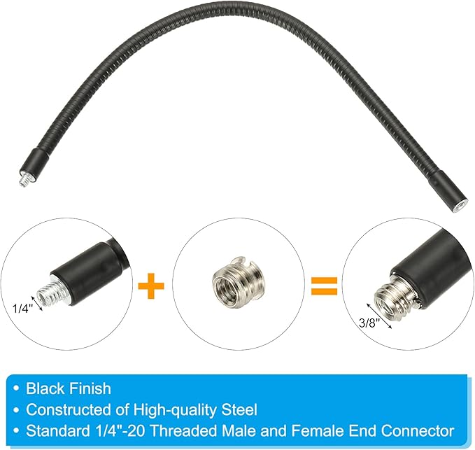 仕様: 全長: 40cm / 15.75"; 外径: 10mm / 0.39"; オススレッド: 1/4"-20; メススレッド: 1/4"-20; レッドシューズスレッド: 1/4" to 3/8" オス内部スクリュー; 素材: メタル; カラー: 黒; 梱包リスト: グースネック 1 セット (レッドシューズ 1 個含む)