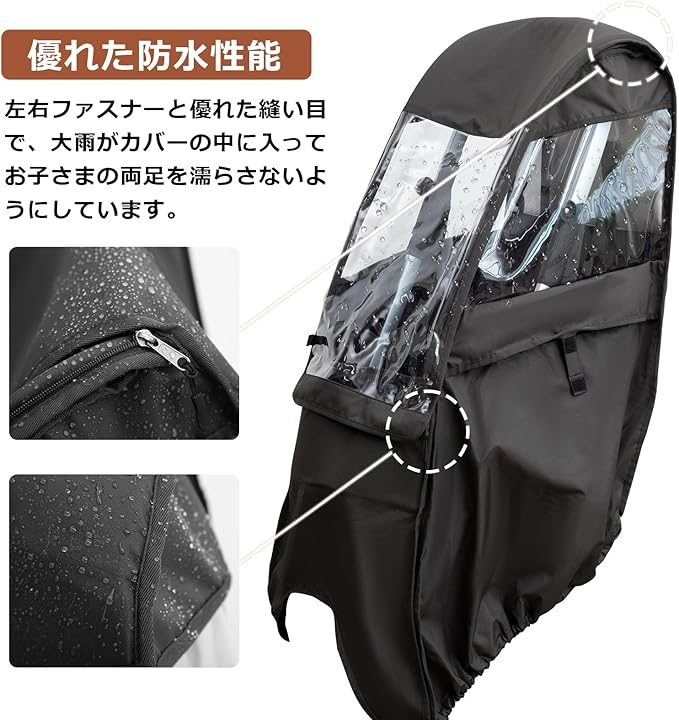 【大雨でも安心な高い防水性能】雨天時でも内部をしっかりと守る、信頼の防水性能を備えています。雨水の侵入を防ぐため、左右のファスナー部分はもちろん、縫い目一つ一つにまで防水処理が施されています。この丁寧な作りにより、たとえ横なぎの大雨が降った場合でも、カバー内部に雨水が浸入するリスクを大幅に低減。お子様の足元を濡らさず、快適なドライブをサポートします。
